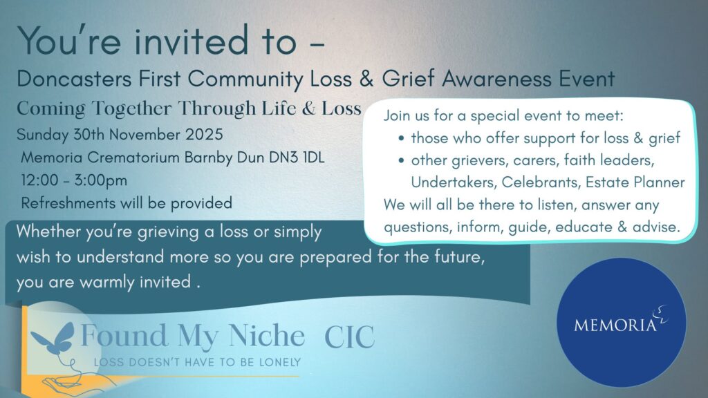 In the run up to National Grief Awareness week from 2 to 8 December, the event titled ‘Coming Together Through Life and Loss’ is taking place this Sunday at Memoria Doncaster in Barnby Dun.